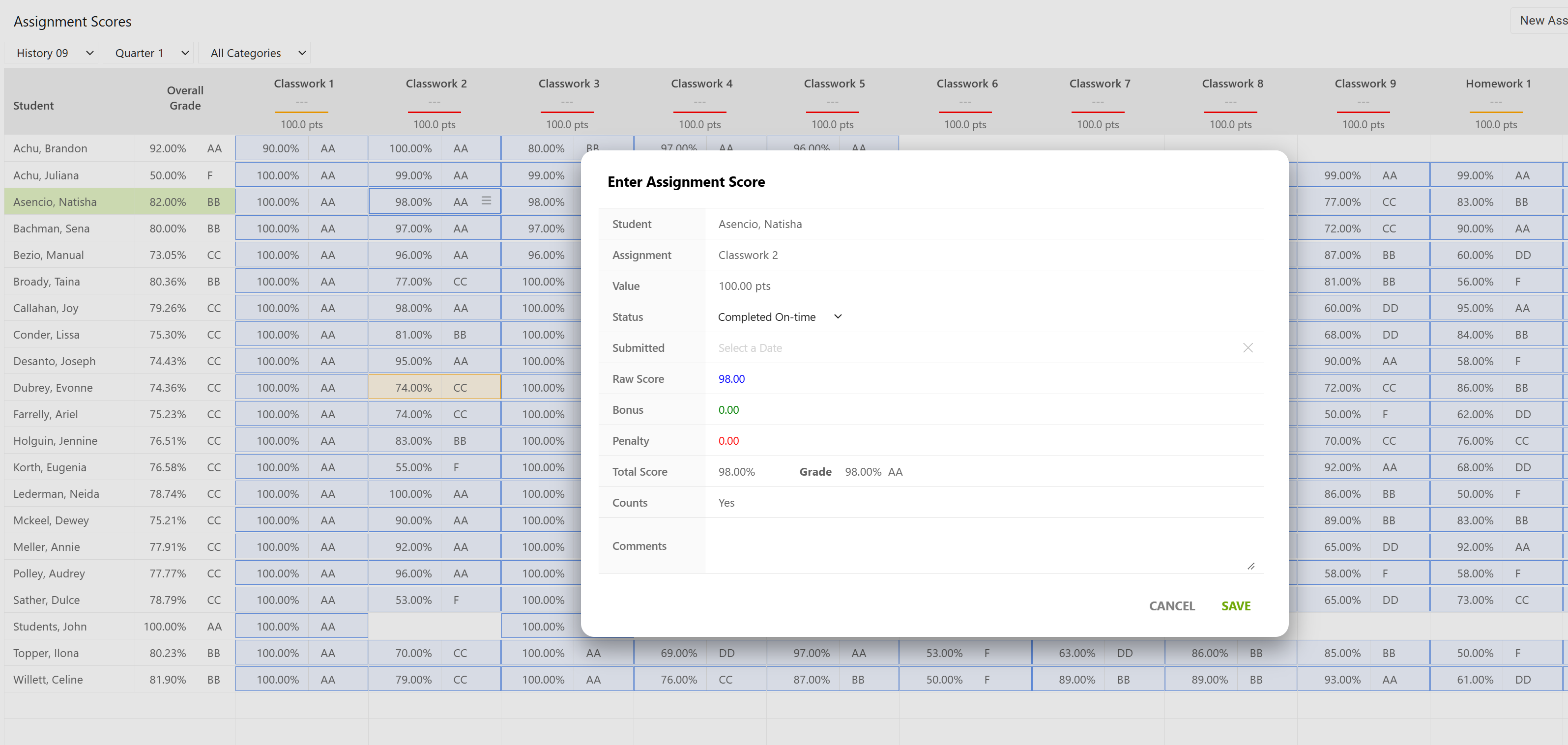 The screenshot below is a spreadsheet-like control that was built for iGradePlus to enter student assignment scores. In addition to the spreadsheet, it also shows a custom dialog that the spreadsheet pops up when a cell is clicked.